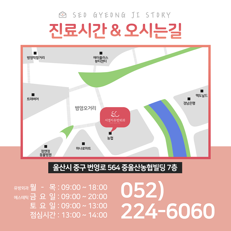 울산광역시 중구 번영로 564 울산 유방외과 ‘선우시장’ 정류장 하차(도보 약 5~10분 소요) ‘병연사거리’ 정류장 하차(도보 약 5~10분 내비게이션 도로명:울산광역시 중구 번영