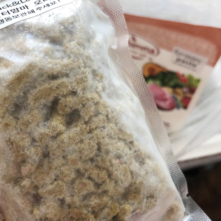 아마 방부제가 들어 있지 않아 냉동보관 꼭 해야 하고 그때마다 필요한 만큼만 냉장실에 두고 전자레인지에 10~15초 정도 돌려 냉기를 빼고 급여하면 된다.