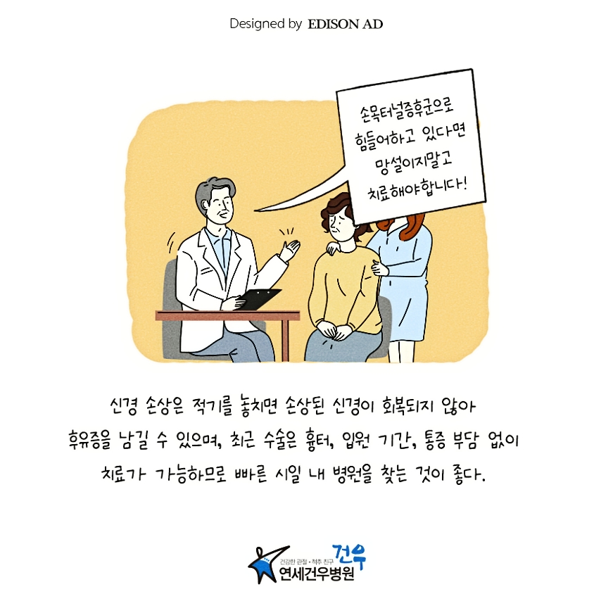 일상생활에서 매우 불편하며 오래 방치하면 손바닥 근육이 위축되어 치료해도 증상 회복이 더디거나 할 수 없으므로 증상이 의심된다면 초기에 적극적으로 치료하는 것이 중요합니다.