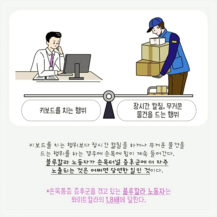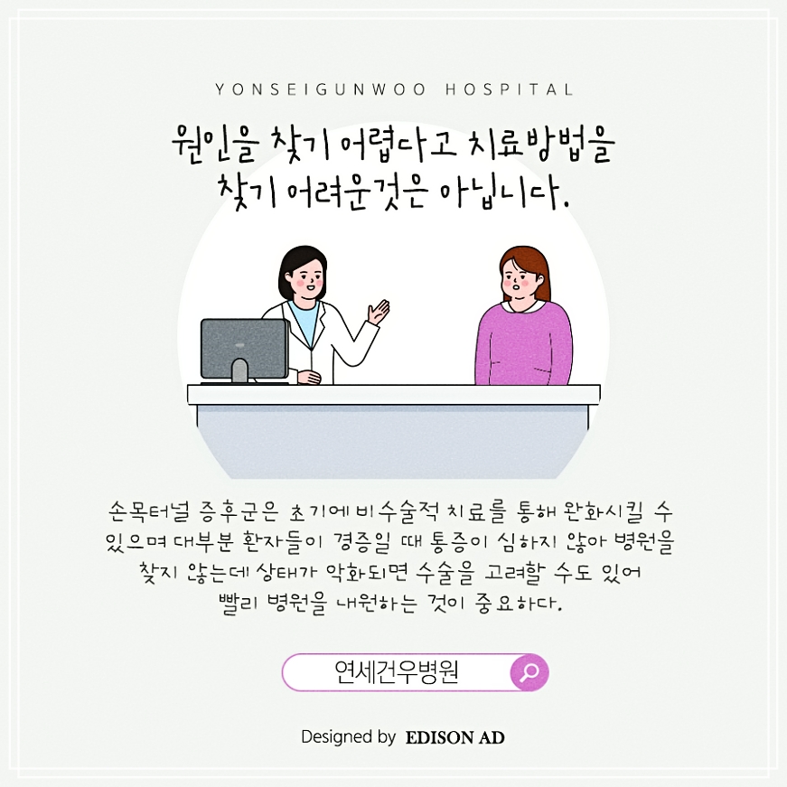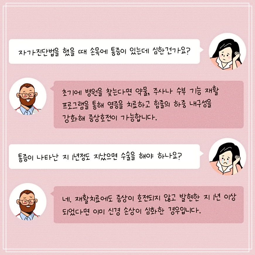 컴퓨터 사용처럼 손목의 지속적이고 반복적인 동작 등은 증상을 악화시킬 수 있기 때문에 특히 높은 발병률을 보이는 중년 여성에게 증상이 나타난 경우에는 초기에 전문 의료진의 진료를 통해 치료를 받는 것이 중요합니다.
