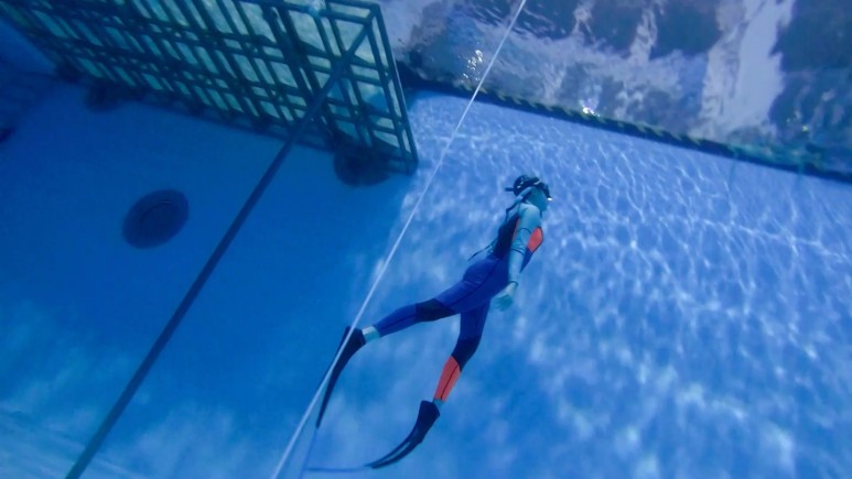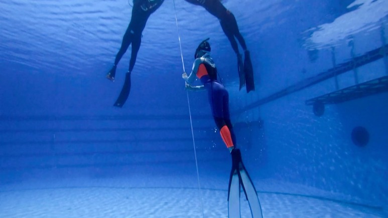 이렇게 깊은 5m 깊이의 수영장을 저 밧줄을 잡고 수직 낙하한다이퀄라이징 연습할 때