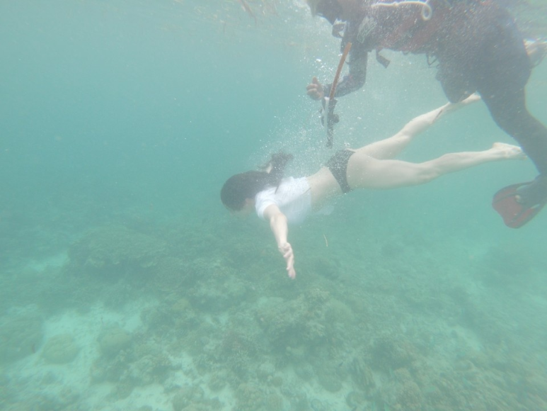물 속에 있을 때의 고요, 물 속에서 들리는 나를 감싼 물소리.물고기와 친구가 된 듯 같은 방향으로 움직이는 즐거움, 물고기 가까이서 보는 즐거움. 스노크가 물고기 위에 떠있을 때와는 또 다른 느낌.스노클을 물고 입으로 호흡하는 그 느낌도 좋고, 스노클을 통해 호흡하는 내 숨소리가 내 귀에서 크게 들리는 것도 좋다.