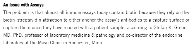 오늘날 대부분의 면역분석에서 항체를 샘플과 반응시키기 위해 포획하는 방법으로 Biotin-streptavidin 인력에 의존하는데, 이 과정에서 비오틴을 복용함으로써 생기는 검체 중 다량의 비오틴은 검사 결과에 영향을 줄 수 있습니다. 검사 방법에 따른 영향의 차이는 있지만 고용량의 비오틴을 복용할 경우 T4는 더 높아지고 TSH는 낮게 나오는 결과를 나타냅니다. 바세도우병이나 갑상선 기능 항진증으로 진단되는 오진을 초래할 수 있습니다.