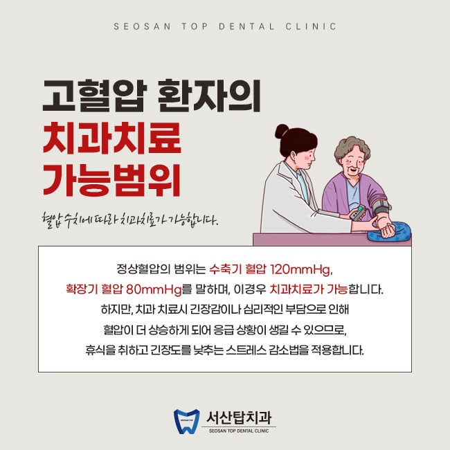 안녕하세요. 자신의 치아를 100세까지 건강하게 유지할 수 있는 방법을 연구하고 있는 서울톱치과병원입니다.고혈압은 현대인이 가장 많이 앓고 있는 전신 질환입니다. 그렇기 때문에 치과에서도 고혈압 환자를 자주 만납니다.모든 고혈압 환자가 치과치료에 어려움을 겪는 것은 아니지만 160/105 이상으로 조절이 안 되는 경우 간단한 구강검사나 충치치료를 할 때 주의 깊게 시행합니다.