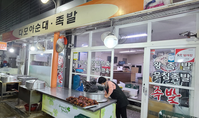 하긴 골목에는 사람이 별로 없는데 안에 택배박스와 함께 많은 사람들이 도마 앞에서 끊임없이 족발만 자르고 있는 이 모습… 공장이다 공장…