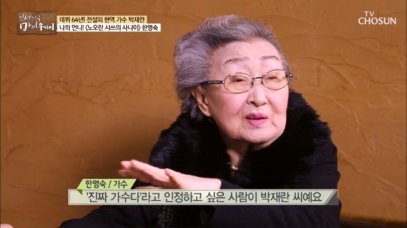 박재란은 자신을 도와준 가수 한명숙과도 만났어요. 그녀는 쇠약해진 한명숙의 모습에 눈물을 흘리면서 속마음을 털어놓았어요.
