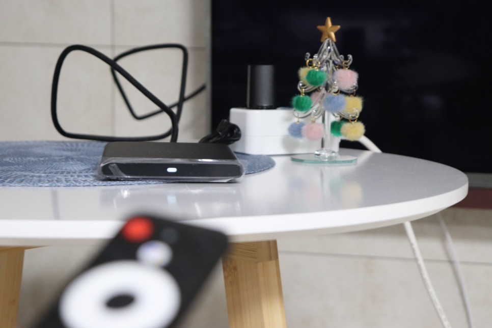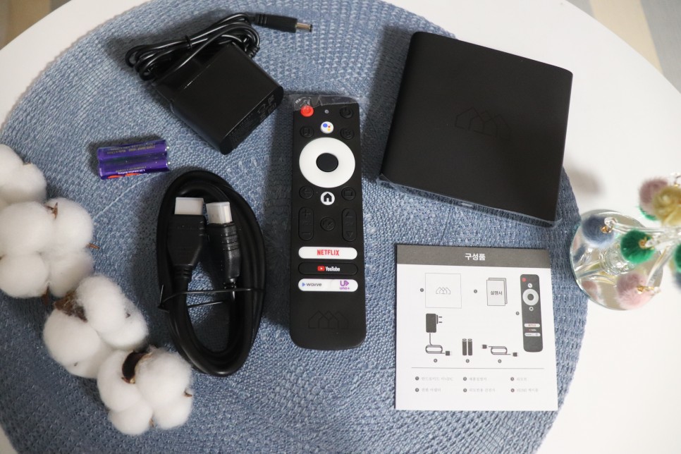호마틱스 박스 큐에는 Android 셋톱 박스 본체와 리모콘, HDMI 케이블, 전원 케이블과 사용 설명서가 들어 있습니다.셋톱박스에 HDMI 케이블과 전원선을 모두 연결하여 각각 TV, 콘센트에 꽂으면 됩니다.리모콘은 셋톱박스를 향해 조작해야 하기 때문에 셋톱박스는 보이도록 해 두는 것이 좋습니다.