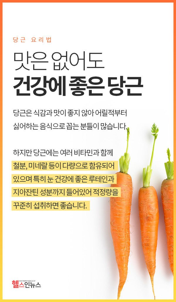 당근을 고르는 방법 당근을 고를 때는 겉이 매끈하고 만져봤을 때 부드러운 것보다는 조금 딱딱한 것이 좋다고 했습니다. 무엇보다 굉장히 주의해서 봐야 할 부분이 수도꼭지 부분입니다. 당근 칼로리 꼭지 주위가 검어지거나 너무 진한 것은 수확한 지 꽤 되었기 때문에 가지런히 하는 것은 그만두는 것이 좋습니다. 또한 꼭지가 크면 당근 안에 심지가 많기 때문에 꼭지가 작은 것을 선택하는 것이 좋습니다. 주의사항 당근을 과음하면 피부가 노랗게 변할 수 있으며 알레르기가 있는 분은 피부 발진이나 설사, 알레르기를 유발할 수 있으므로 주의가 필요했습니다.
