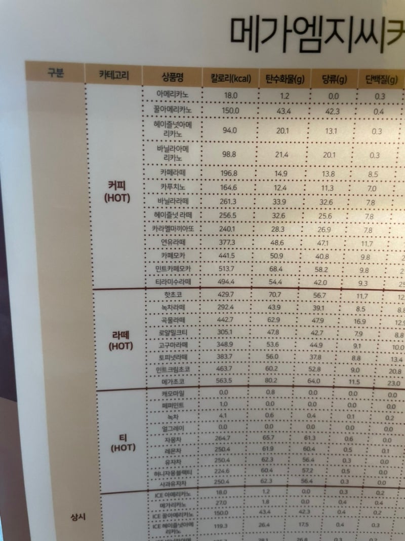 메가커피열량 메가커피카페라떼열량은 196kcal. 달콤한 메가커피 바닐라라떼열량은 261kcal이나 되네요!(메가커피열량표가 작아서 잘 안보이죠)
