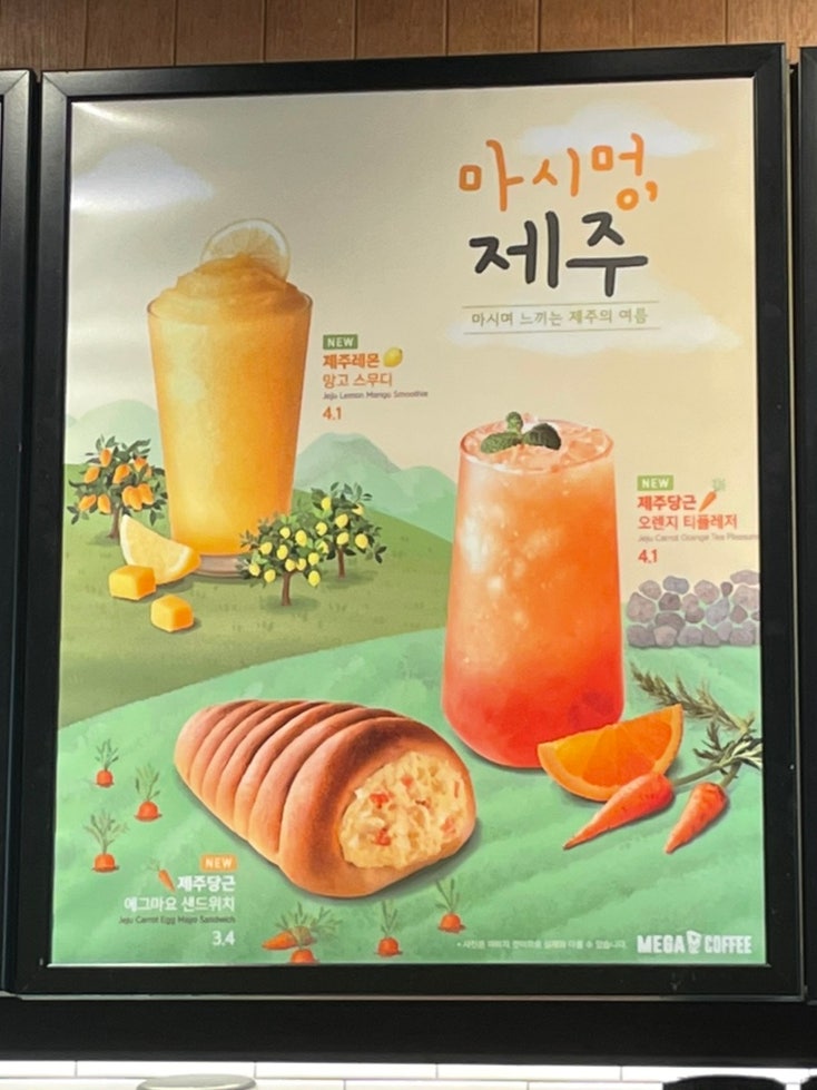 메가커피 신메뉴 메가커피 메뉴는 벽에도 붙어있었어요.푸른 제주도를 컨셉으로 한 메가커피 메뉴도 좋을 것 같네요.