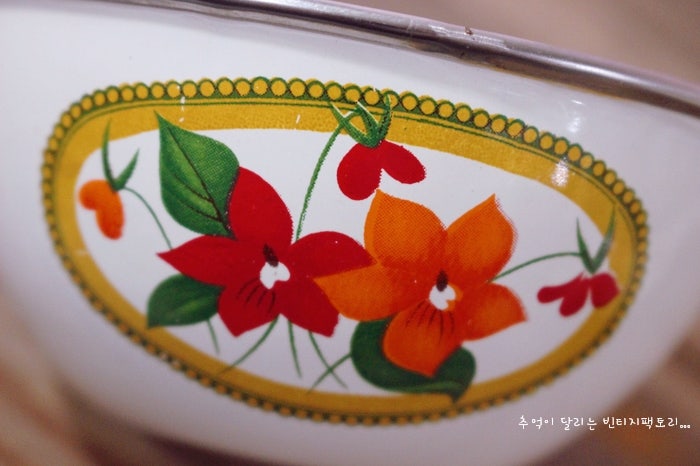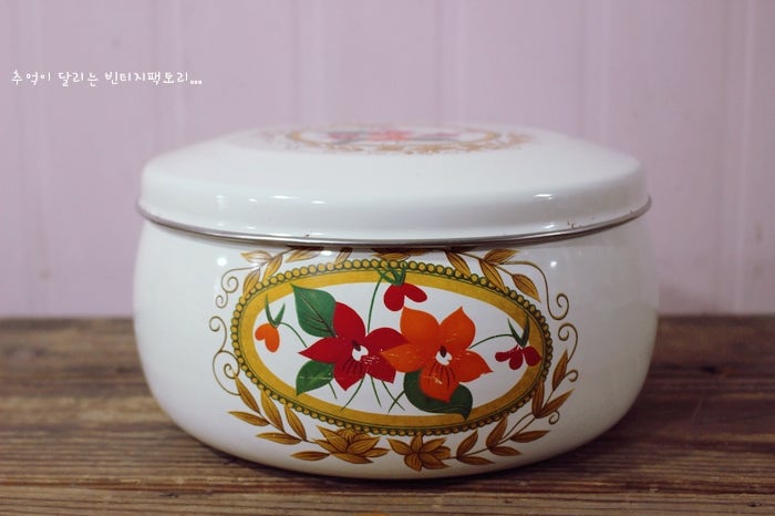 비슷한 꽃무늬가 측면에 총 3곳 확인되었으며,오리지널 빈티지 소품이라 뚜껑 가장자리 부분이 살짝 찌그러진 부분이 보이기도 하고빈티지 법랑 특유의 에나멜 긁힘이 보이기도 하는데 에나멜 코팅이 벗겨져서 검은 철이 그대로 보이기도 하고 그런 부분을 뭔가로 다시 칠해서 살짝 메운 부분도 보이기도 합니다.뚜껑을 열어보니 내부는 비교적 깔끔한 편이라안쪽에도 살짝 벗겨지고테두리부분에도 약간 빈티지한 느낌도 보이는데사용감은 거의 느껴지지 않네요!뒷부분도 약간 올풀림이 있어요.2단은 1단과 잘 연결되어 있고 어느 정도 고정되어 있어야 하기 때문에 뚜껑이 평평하고 테두리가 조금 올라간 것 같네요~역시 같은 모란꽃무늬가 정말 빈티지하고 화사하게 피어있어요.여기도 원래 에나멜 칠이 벗겨진 부분인 것 같은데 역시 하얀 무언가로 채운 부분이 보이기도 합니다.역시 뚜껑을 오픈한 내부는 비교적 깔끔하지만,자세히 보면 세월감이 있을 수도 있고역시 별도의 사용감은 보이지 않습니다.2단 법랑 찬합은 뒷부분도 비교적 예뻐!!!오리지널 빈티지 소품으로 식품을 담는 것보다 예쁘고 귀여운 소품을 넣어 사용하면 분위기가 각별히 멋진 인테리어 완성!둘이 헤어지지 않고 세트로 함께 와서 더 귀하고 예쁜 모란꽃, 예쁜 빈티지 2단 법랑 찬합….< 빈티지 인테리어 소품 빈티지 팩토리>
