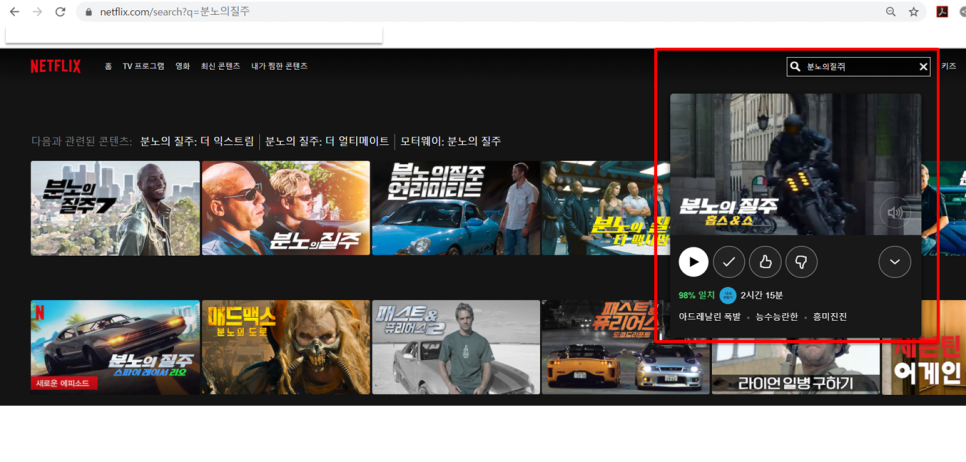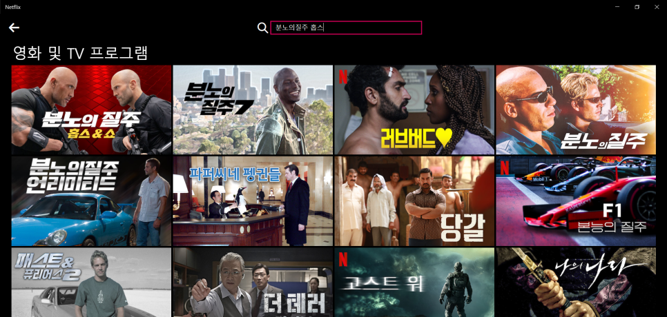 3. 기존에 등록된 계정을 통해 로그인하면 넷플릭스 홈 화면이 나오는데 원하는 영화 또는 프로그램을 검색합니다. 저는 웹사이트와 비교하기 위해 똑같이 분노의 질주를 검색해 봅니다.