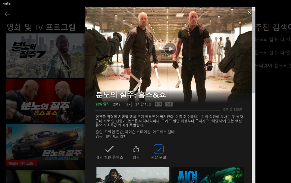 넷플릭스 홈페이지 크롬에서 넷플릭스에 접속해 와일드 스피드를 검색/선택하는 화면입니다. 모바일 앱과 달리 저장 버튼이 보이지 않죠?하지만 PC에서도 앱 형태의 넷플릭스를 통해 서비스를 이용하면 모바일 앱과 마찬가지로 넷플릭스 영화 다운로드가 가능합니다!