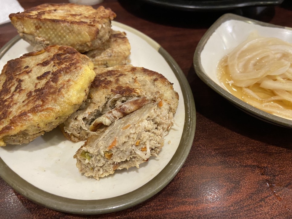 경단은 통통하지만 다진 고기와 야채가 많이 들어 있어서 통통하게 구운 경단 아이들도 먹기에 좋을 만큼 맛은 그리 강하지 않았다.나는 그냥 저냥 먹기엔 괜찮았는데 남편은 옥천냉면 경단이 더 맛있다면서 반만 먹고 안 먹는다.