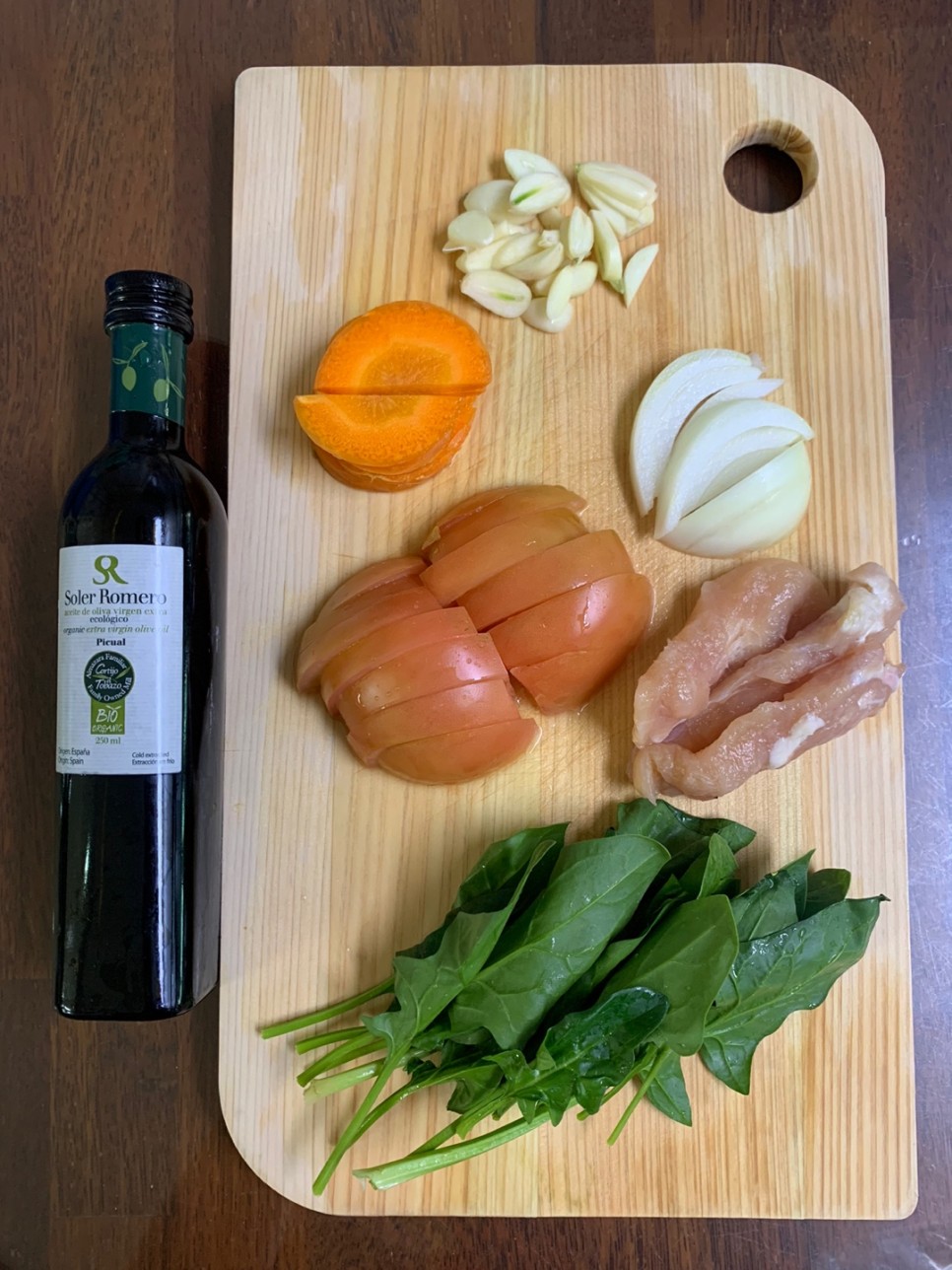 닭안심1) 토마토2) 당근3) 시금치4) 양파5) 마늘6) 올리브유7) 기호에 따라 소금과 후추* 닭안심은 스크램블에그로 대체 가능 * 각 재료별 양과 손질은 아래 사진에서 대충 참조