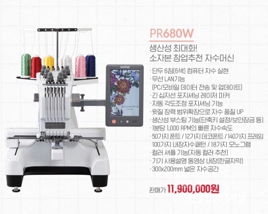 PR680W는 PR670E 후속모델로 생산성 극대화와 소자본 창업 시 자수머신으로 추천합니다.컴퓨터 자수를 실현할 수 있으며 무선랜 기능이 있어 편리하게 사용할 수 있습니다.자동 각도 조절과 생산성 부스팅 기능이 있어 생산성까지 최대한 높일 수 있습니다.