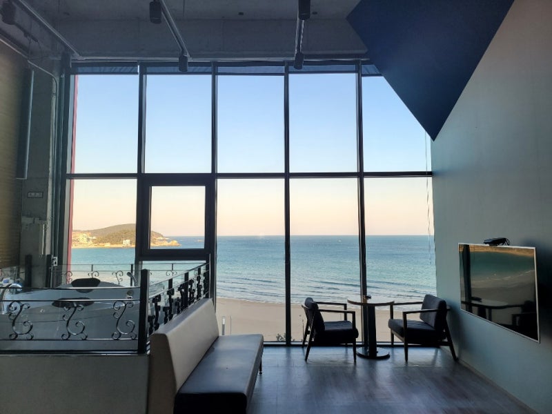부산 송정펜션 넛지 567 입니다.저번에 2층에 있는 넛지5 카페만 가봤는데 펜션에 이번에 처음 가봤어요!생각보다 뷰가 좋아서 너무 재밌게 놀다 왔어요.저희는 넛지 6호실을 골랐습니다.2인실에 최대 4인까지인데 저희는 3인이라 1인 요금을 추가로 지불했습니다.