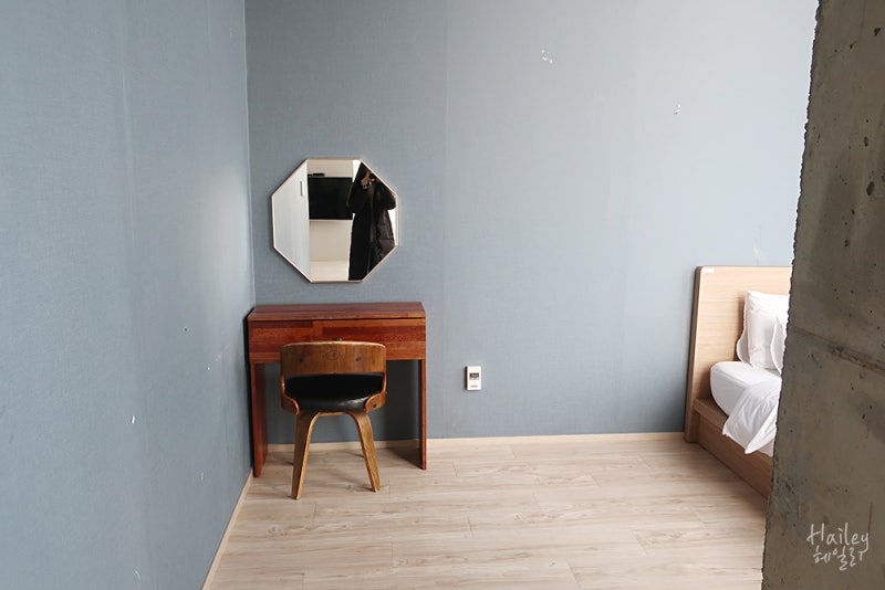 안쪽으로 들어가면 이렇게 화장대와 침대가 있어요.부산 송정펜션의 넛지 567은 전체 유리로 되어 있어서 뷰가 너무 좋았는데 아침에는 정말 등이 뜨거워 죽을 뻔 했어요. 커튼을 단단히 치고 자야 해요. 여기는 화장대 안에는 고데기 헤어드라이기 멀티탭이 있었어요.무겁게 고데기를 가져갔는데 허무해… 흐흐흐