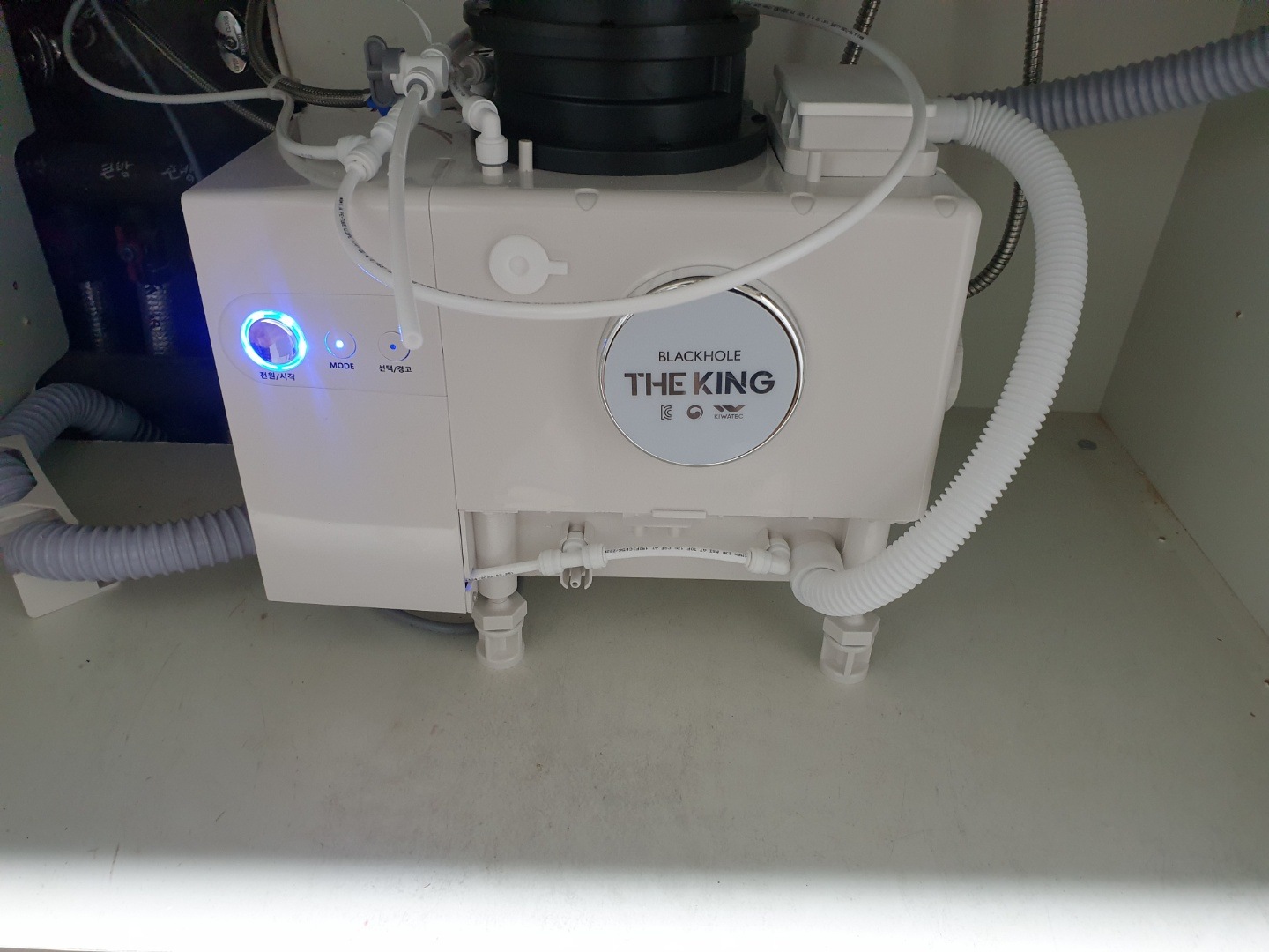이부분이 기존에 있던 하수구통?을 분리하여 설치되는 부분이라 여기가 분쇄실처럼 체결방식이라 싱크대 구멍뚫지 않아도 되니 이중비용을 줄이고~ 전세도 편하게 사용하고 이사할때는 이전 설치하시면 되므로 설치형이지만 가벼운 마음으로 설치하실 수 있었다!!