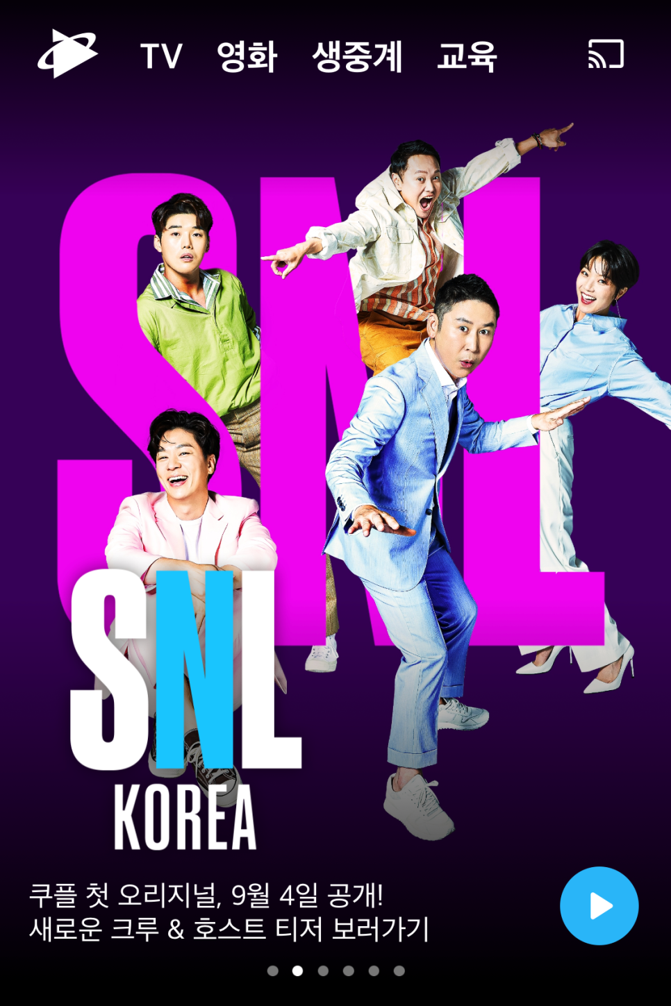 제가 즐겨보는 OTT 쿠팡 플레이로 9월 4일 SNL 코리아가 시작됩니다SNL 코리아는 쿠팡플레이 오리지널 컨텐츠로 쿠플에서만 볼 수 있습니다.