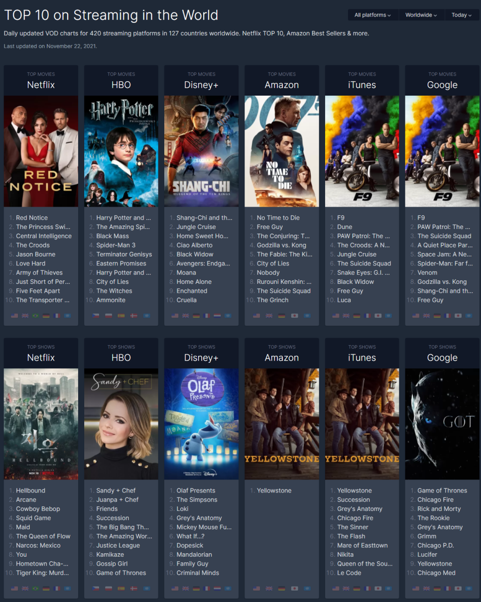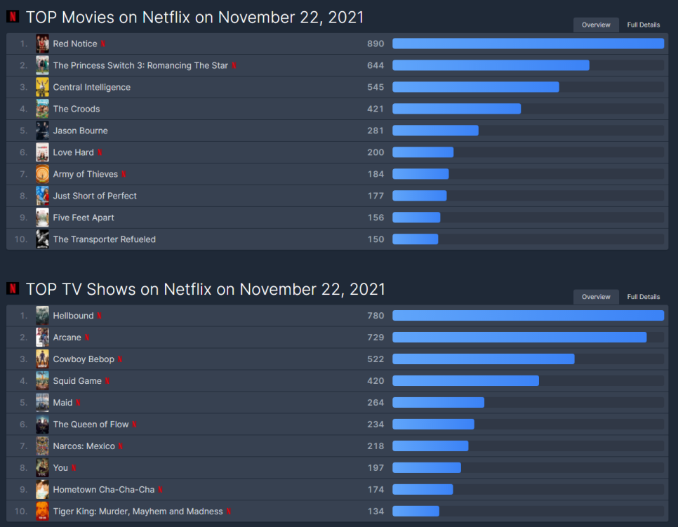 영화 부분에서는 전 세계에서 레드노티스가 독주하고 있습니다드웨인 존슨이 출연한 액션영화에서 스트레스 해소가 좋다고 해서 주말에 한번 보려고 해요.