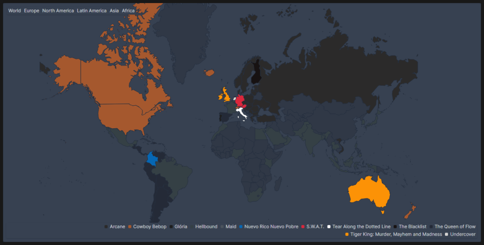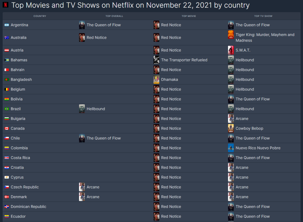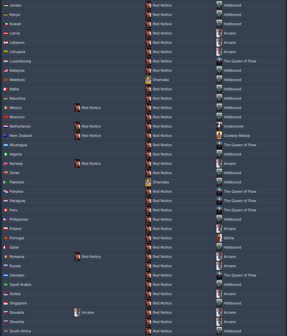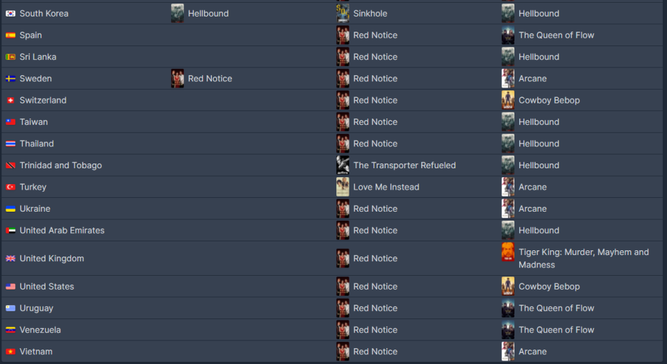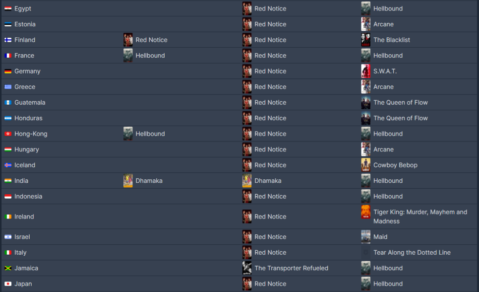 대부분의 나라에서 영화는 레드노티스, TV show는 아케인과 지옥을 많이 볼 수 있지요.