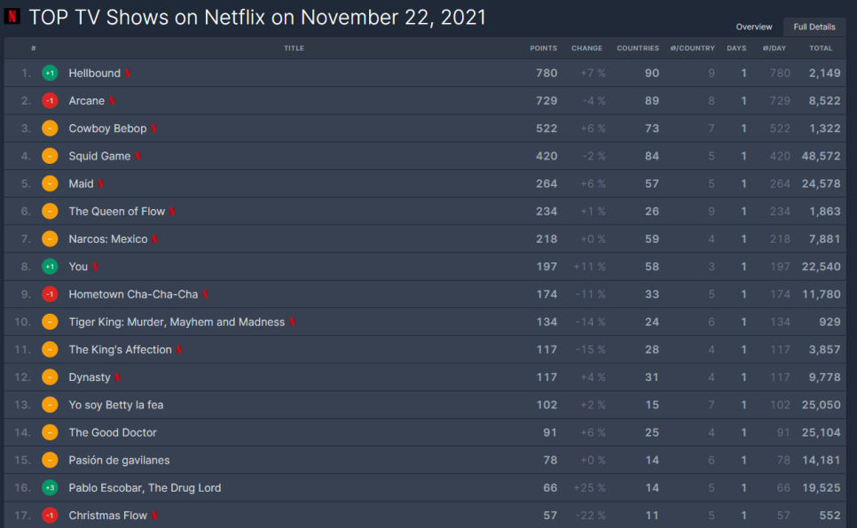 사이트에 들어가 보시면 아시겠지만 영화와 TV쇼 부분이 나뉘어져 있어요오징어 게임, DP 등 시리즈 및 시즌에 공개되는 작품은 TV SHOW 장르입니다.리그 오브 레전드 애니메이션 어케인이 1위를 했다는 뉴스를 얼마 전에 본 것 같은데 순식간에 지옥에 역전당해 2위로 내려간 것을 알 수 있어요.