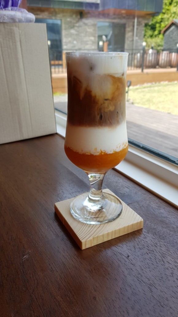 감귤비앙코라떼를 완전 섞은 모습색깔이 커피 색깔이 아니라 심오한 색깔이…