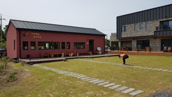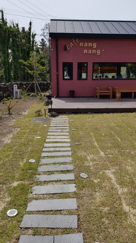 잔디 옆 돌계단? 입구를 지나 천천히 카페 낭낭으로 입장… 자연의 향기를 느낄 수 있다.오염심이 심한 도심을 떠나 제주도로 오는 이유가 이거구나!!! 정말 공기도 좋고 바람도 좋다~^^