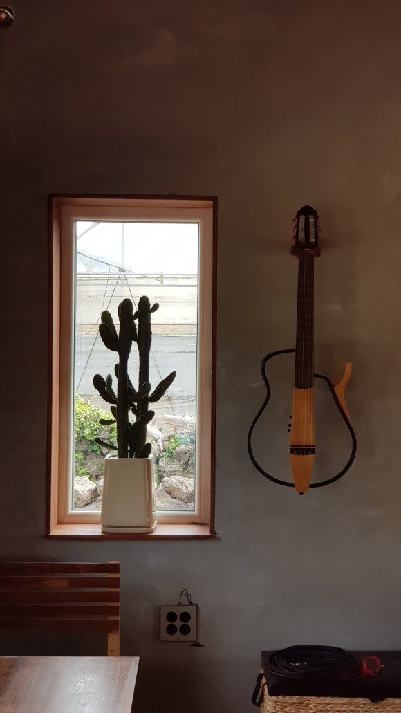 카페 한쪽에 있는 선인장과 기타 인테리어 선인장과 기타… 기타를 인테리어로 쓰다니… 역시 가수가 생각하는 인테리어는 다르네… 참 특이하지만 분위기 있고 예쁘다.여기 엄마가 진짜 좋아하셨어