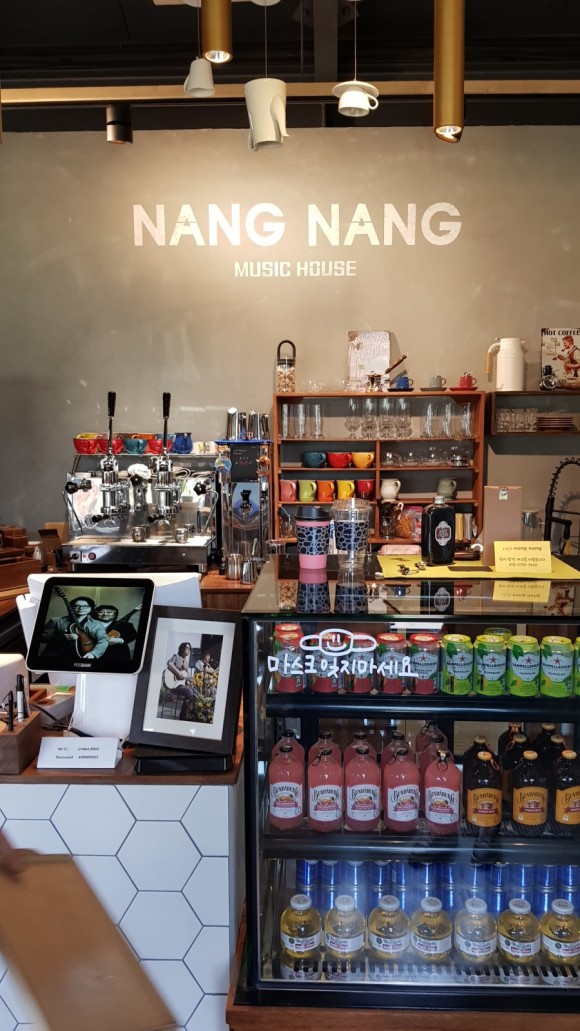 카페 낭낭에 드디어 입장~^^입구에 보이는 가수 해바라기 사진과 함께 마스크를 잊지 마세요~^^맛있는 탄산수 음료와 각종 과일음료와 커피잔이 마주보고 있습니다.카페 주인의 센스가 돋보이는 카운터.