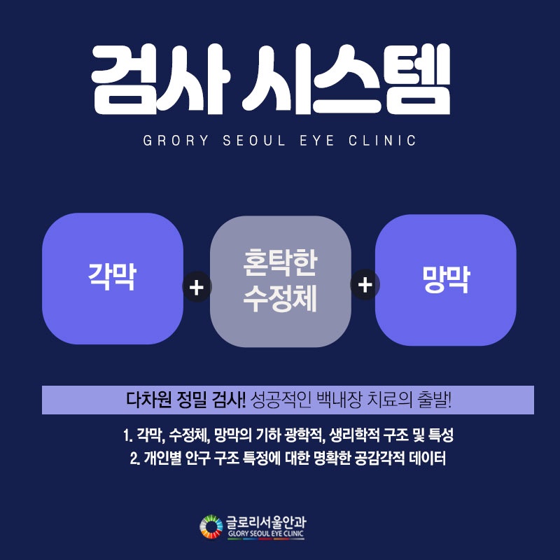 백내장은 초기에 진단하고 치료를 계획함으로써 보다 긍정적인 시력 회복에 도움이 되었습니다. 만일 증상을 오래 방치하거나 치료시기를 놓칠 경우 수정체가 뻣뻣해져 수술을 하기가 어려워질 수 있고, 백내장 수술 부작용의 발생 위험이 높아지고 시력 회복 속도도 느려질 수 있기 때문입니다. 초기에는 우선 약물치료를 통해 병의 진행을 늦추지만 궁극적으로 수정체의 탁함을 제거하고 새로운 인공수정체를 삽입하면 시력이 개선되기 때문에 일상생활에 불편이 클 때를 적당한 수술시기로 보고 계획하는 것이 바람직했습니다.수술 전에는 7단계의 70여 가지 정밀검사를 통하여 각막에서 수정체, 망막, 시신경 등 눈의 전체적인 건강상태를 체크하고 그에 적합한 수술방법을 찾을 수 있으나, 백내장 이외에 시력에 영향을 줄 수 있는 질환이 있는 경우에는 백내장 수술이 잘 되어도 시력의 질이나 결과에 만족하지 못할 수 있으므로 반드시 철저한 검사과정을 거치는 것이 중요하였습니다.