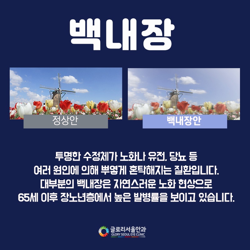 백내장이 발생하면 처음에는 시력 저하 이외에 아무런 증상도 나타나지 않기 때문에 많은 분들이 노안과 혼동할 수 있는데, 여기서 중요한 것은 어느 정도의 거리가 잘 보이지 않는지 체크하는 것이었습니다. 만약 노안만 있으면 근처의 것, 작은 글자가 잘 보이지 않는 반면, 백내장까지 동반한 경우는 먼 거리의 것, 사람도 구별하기 어려울 정도의 시력 저하가 일어날 수 있었습니다.초기 단계를 넘어서면 사물이 둘, 셋으로 겹쳐 보이는 복시증상이나 빛의 확대, 눈부심 등 시력장애가 동반될 수 있고 색이 노랗게 보이거나 낮보다 밤에 더 잘 보이는 주맹증상 등의 증상도 나타날 수 있는데. 안경이나 돋보기만으로 해결할 수 없는 증상이었기 때문에 일상 생활에 큰 지장을 초래할 수 있었습니다.