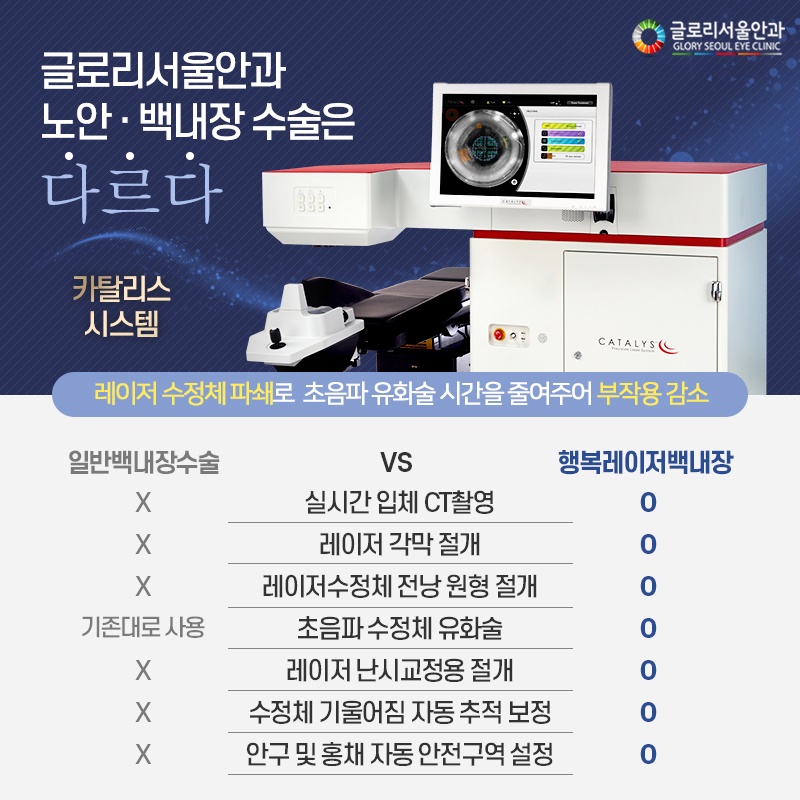현재 많은 안과에서 이루어지고 있는 레이저 백내장 수술은 기존 수기 방식 수술의 단점을 보완하는 방법으로 사람의 손과 눈이 아닌 자동화 기술의 시스템을 활용하고 있었습니다. 카탈리스 레이저 시스템은 3DOCT 기능으로 환자의 눈 상태를 마이크론 단위까지 꼼꼼히 체크하고 그에 적합한 수술 계획을 세울 수 있으며, 로우 에너지의 펨토세컨드 레이저를 이용하여 수정체를 깔끔하게 원형 절개할 수 있어 불필요한 조직 손상과 백내장 수술의 부작용, 후유증의 걱정을 덜어 줄 수 있었습니다.본원의 레이저 백내장 수술은 다른 레이저 수술과 달리 단단한 재질의 옵틱이 아닌 리퀴드 옵틱을 사용함으로써 각막의 변형, 안압 상승 등의 위험을 감소시켰으며, 특히 수정체 기울기 자동 보정 기능을 통해 인공 수정체를 정확한 위치에 삽입함으로써 최고의 시력을 이끌어냈습니다.