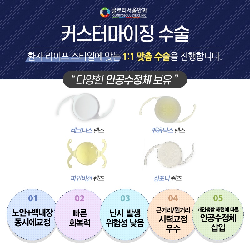 인공수정체는 본래 수정체가 수행하던 기능을 대신하는 것으로 한번 삽입하면 특별한 문제가 없는 한 영구적으로 사용되는 것이므로 눈의 상태와 함께 생활방식에 맞게 신중하게 선택하는 것이 중요하였습니다.인공수정체의 종류는 크게 단초점과 다초점이 있으며, 최근 인기를 끌고 있는 다초점 인공수정체는 근거리, 중간거리, 원거리 모두에 연속적으로 초점을 맞출 수 있기 때문에 노안과 백내장, 근시, 원시, 난시 등의 굴절이상을 한번에 교정할 수 있으므로 이를 통해 돋보기, 안경을 쓰지 않고도 자연스럽고 편안한 일상생활을 할 수 있도록 하였습니다.