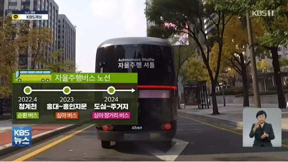 자율주행 노선버스 시범운행 계획은 2022년 4월 청계천, 2023년 홍대~흥인지문, 2024년 도심~주거지 등입니다.