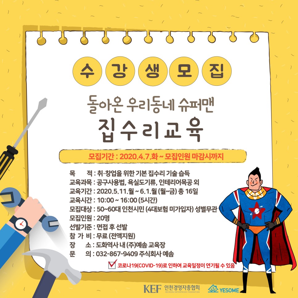 봄과 함께 5월 예섬에서 인천시민을 대상으로 집수리 교육을 실시하고 있습니다고용노동부와 인천광역시가 주관하고 인천경영자총협회화 예섬이 주최하는 2020년 지역·산업 맞춤형 일자리 창출 지원사업 ‘돌아온 우리마을 슈퍼맨 집수리 교육’