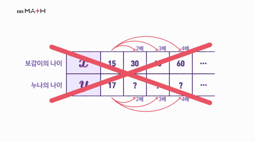 보감 : 내가 아까 내 나이 x살과 누나 나이 y살이 왜 수학에서 말하는 정비례 관계가 아닌지 이제 알겠지?