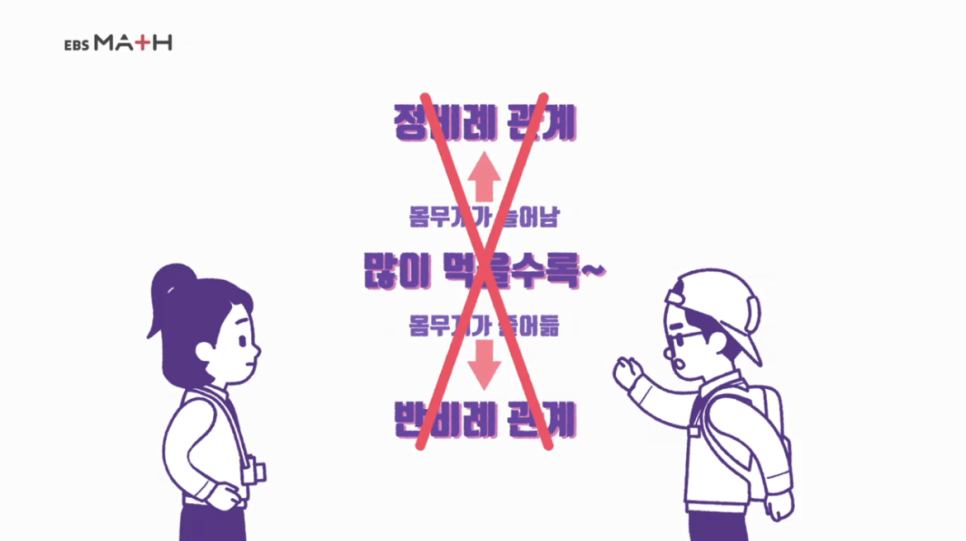 알아! 많이 먹을수록 체중이 늘면 정비례 관계! 체중이 줄면 반비례 관계 아냐?