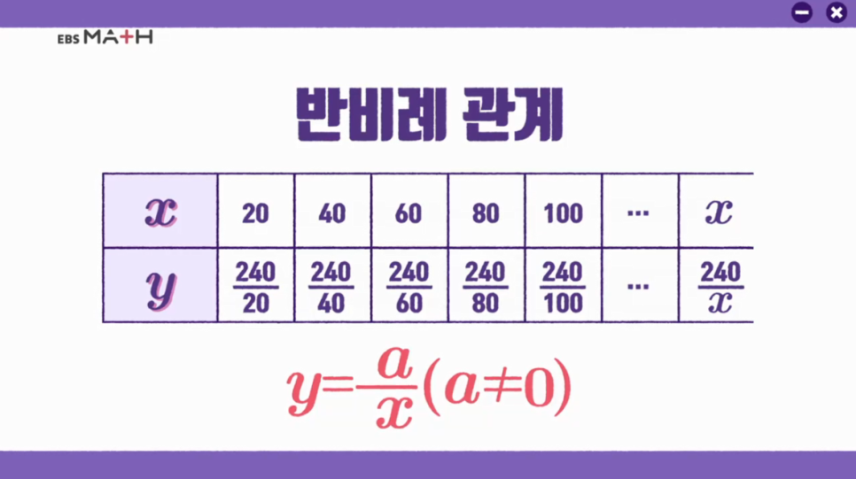x와 y의 관계를 식으로 나타내면 240 /20, 240/40, 240/60, 240/80과 같이 y=240/x가 될 것이다.