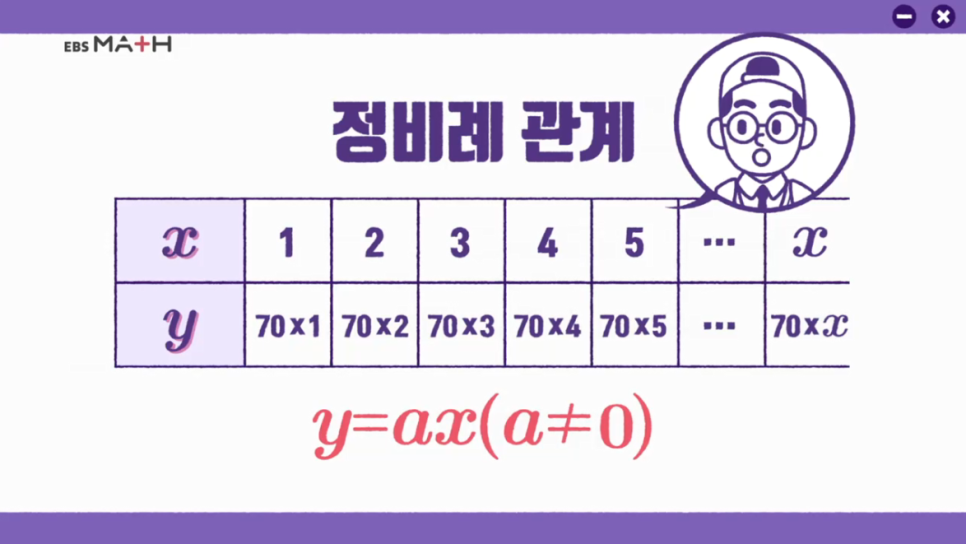 그러니까 이 관계를 식으로 나타내면 「y = 70x」가 된다.