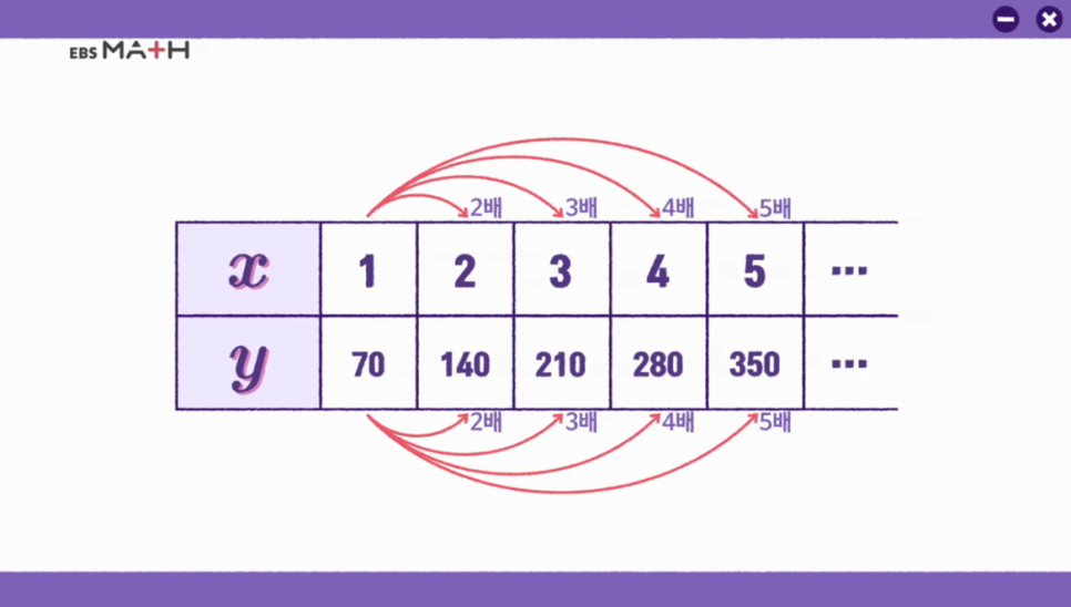 앞 표에 xy관계를 살펴보면, x가 1일 때 y는 70x1x가 2일 때 y는 70x2x가 3일 때 y는 70×3