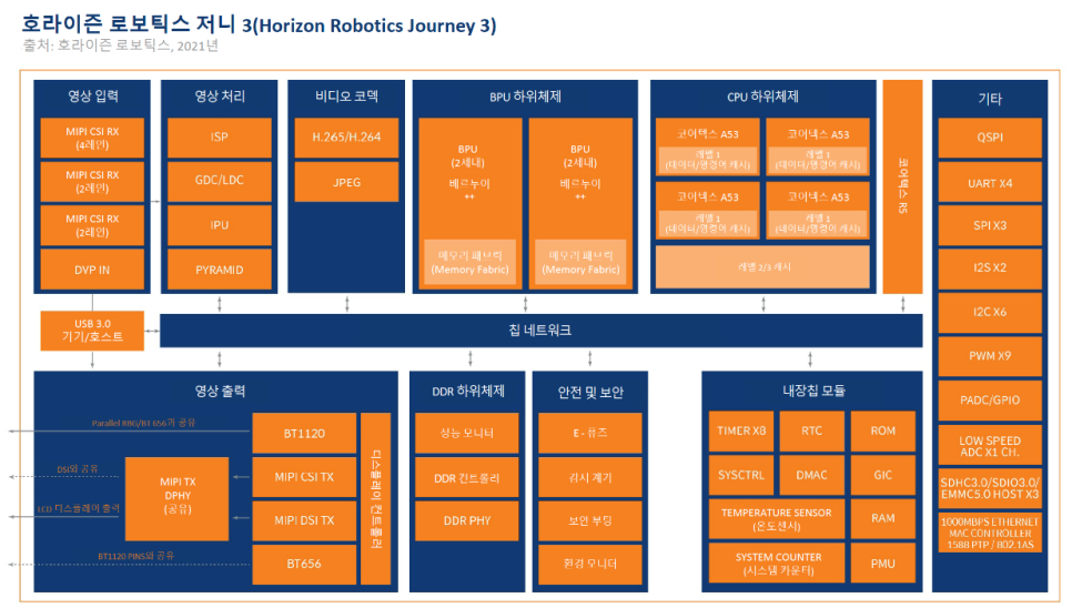 자동운전팁의 중요성=자동운전 자동차는 내장센서를 이용하여 방대한 양의 데이터를 수집합니다. 각 차량은 수집된 데이터를 기반으로 실시간으로 머신러닝 모델을 돌리는데, 이때 강력한 연산 능력이 필요합니다. 따라서 자율 주행 칩의 대부분은 CPU (중앙 처리 장치), GPU (그래픽 처리 장치), NPU (신경망 처리 장치), ISP (이미지 시그널 프로세서)가 하나로 통합된 단일 칩 (SoC*)을 사용함으로써 연산 능력을 향상시킵니다. 대표적인 예로서, 현존하는 팁 중 가장 우수하다고 평가되는 테슬라 FSD 팁은 범용적인 CPU 3개(ARM 기반, 12-코어), 인공신경망을 위한 NPU 2개, 후처리를 위한 GPU 1개로 집적되어 있습니다.* SoC (System-On-Chip) – 한 개의 칩에 다양한 시스템 집적하여 연산, 데이터 저장, 아날로그 및 디지털 신호 변환 등의 기능을 한 번에 수행할 수 있는 단일 칩 반도체를 말합니다.