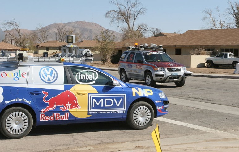 <다퍼그랜드 챌린지 20 07에서 스탠퍼드팀 차 “Stanley”(파랑)와 버지니아텍 대학팀 차 “Victor Tango”(회색)가 교차로에서 만난 장면, 출처 : Wikipedia>