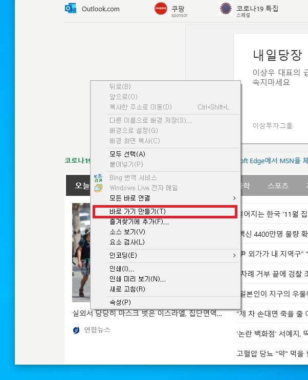 1.엣지 또는 크롬 브라우저에서 아이콘으로 만들고 싶은 사이트를 방문합니다.**마이크로소프트 엣지 또는 구글 크롬 브라우저에서 동일한 방법으로 적용할 수 있습니다.2. 브라우저 뒤에 바탕화면이 보이도록 창을 조정합니다.3. 주소창 주소가 있는 부분에서 마우스로 한번 클릭합니다.4. 주소가 파란색 음영으로 선택되면 해당 주소를 드래그 앤 드롭으로 데스크톱으로 드래그 합니다.