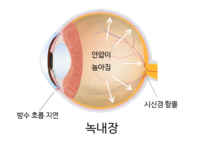 녹내장은 크게 급성과 만성으로 나누어 설명할 수 있습니다. 급성 녹내장이 발병한 경우 통증이 심하므로 응급실에 내원하여 치료를 받게 됩니다. 안통과 두통, 메스꺼움 등의 증상으로 응급 치료가 필요한데요. 방수 배출구가 갑자기 막혀 안압이 급격히 높아지기 때문에 빠른 치료가 관건이며, 만약 2시간 이내에 적절한 치료를 받지 못할 경우 치명적이고 영구적인 시력 손상으로 이어질 수 있습니다. 만성폐쇄각 녹내장은 안압의 뚜렷한 변화 없이 서서히 진행되기 때문에 자각증상이 거의 없고 시야손상 등의 증상을 느끼는 경우는 이미 상당히 진행된 이후인 경우가 대부분입니다.