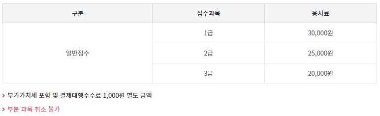 시험 응시료는 1급이면 3만원, 2급이면 2만5천원, 3급이면 2만원입니다.