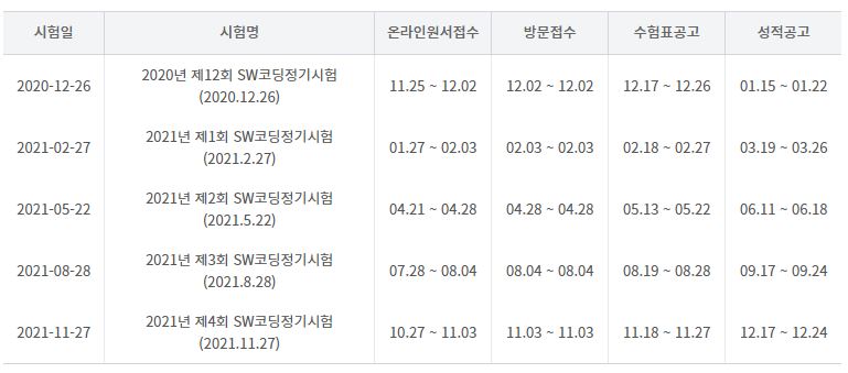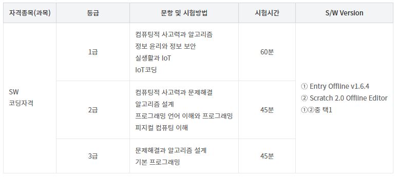 SW코딩자격시험 급수별 시험과목은 다음과 같습니다.:)