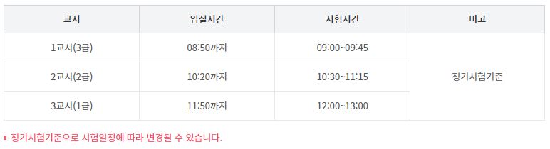 시험시간은 응시자 급수에 따라 차이가 있습니다. 1급의 경우 낮 12시~오후 1시, 2급의 경우 오전 10시 30분~11시 15분, 3급의 경우 오전 9시~오전 9시 45분입니다. 🙂