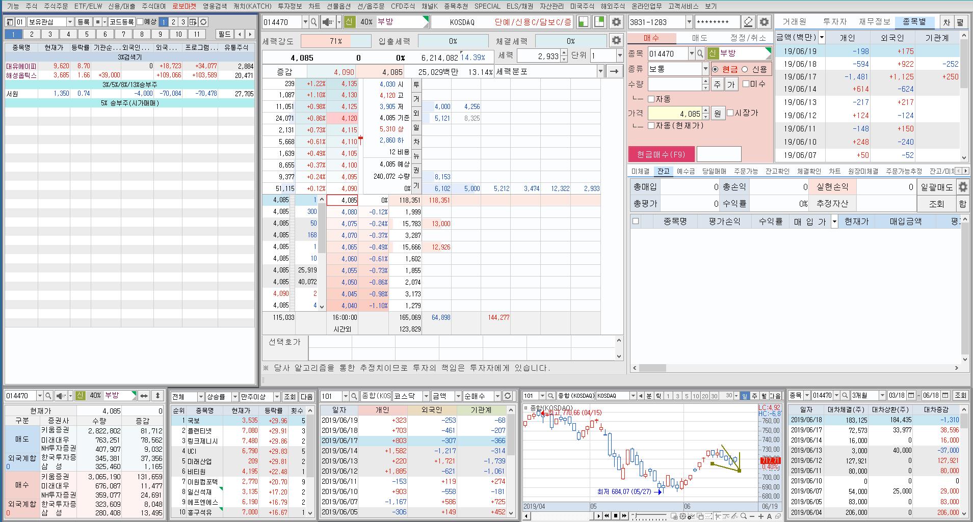 저는 요즘 호가찬 기반 모멘텀 트레이딩을 자주 합니다.첫 화면으로 설정하여 주로 주식 트레이딩을 합니다.두 번째 화면은 주로 종합지수 정리 용도죠. 제가 주로 확인하는 것은 당일 프로그램 매수 상위와 외국인 창구 매수 상위입니다.주식 선물 시장의 상위 종목을 중심으로 보고 있습니다.장중 거래량 회전율이 급증하는 펌핑 종목의 호가 증가 패턴성을 중심으로 상승 모멘텀 가속도를 평가하여 주식 트레이딩합니다.프로그램 매수 상위와 외국인 창구 매수 상위는 코스피, 코스닥 프로그램 경향과 개별 종목 프로그램 경향의 상관관계가 높은 종목을 중심으로 돌파매매가 자주 나오는 펌핑 종목을 좋아합니다.중소형 테마주는 주로 펌핑 가속도라는 거래량 회전율 증가세와 주가 상승률의 상관관계를 분석해서 실시간으로 화주 추종매매 트레이딩을 많이 하죠. 뭐 알려드려도 저와 마찬가지로 주식 트레이딩이 가능한 주식 트레이더 분들도 거의 없어서요.그냥 요즘 저는 이렇게 주식시장에서 생계를 유지하며 살고 있다고 생각했으면 좋겠어요.